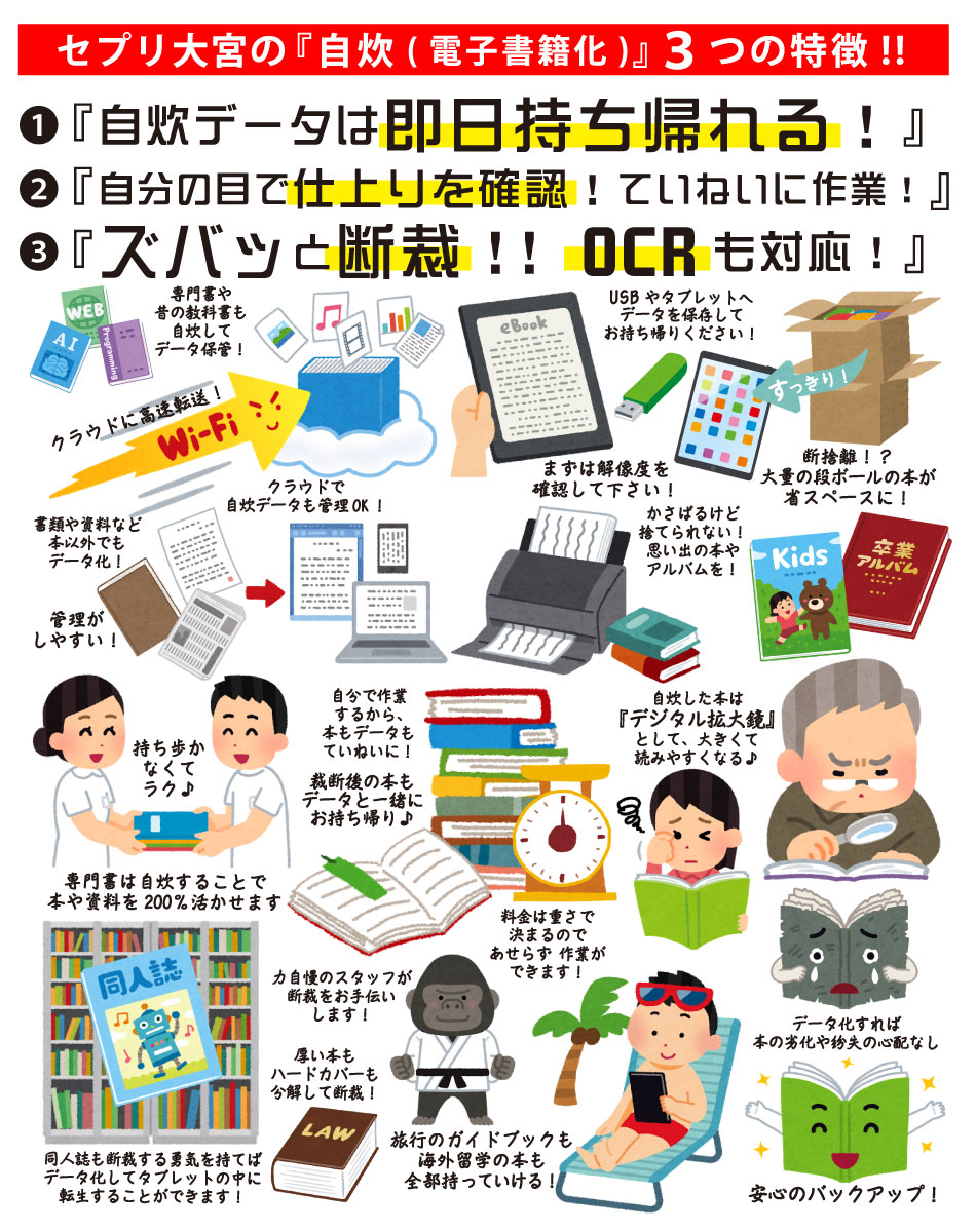 本の自炊(じすい)は、本を裁断してスキャンして、本の内容をデータ化をすることです。